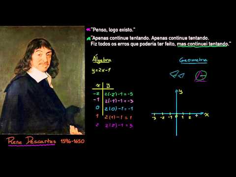 esse aqui ao lado é um retrato de renê decat mais uma vez uma das grandes mentes tanto em matemática como em filosofia e acho que você vai ver aqui um pouco de uma tendência de que os grandes filósofos foram também grandes matemáticos e vice versa e ele era meio contemporâneo de galileu era 32 anos mais jovem embora tenha morrido um pouco depois de galileu ele morreu muito muito muito mais jovem galileu estava bem nos seus 70 anos de casa e morreu com apenas 54 anos de idade e provavelmente é mais conhecido na cultura popular por esta situação aqui uma situação muito filosófica penso logo existo mas queria também acrescentar isso não está relacionado com álgebra apenas acho que foi uma situação realmente maravilhosa e provavelmente a sua frase - famosa festa aqui em cima e gosto dela porque é muito prática e faz você perceber que esses grandes mestres essas mentes esses pilares da filosofia da matemática no fim do dia eles eram apenas seres humanos e ele disse apenas continue tentando fiz todos os erros que poderia ter feito mas continuei tentando que acho que é uma orientação de vida muito muito boa agora ele fez muitas coisas em filosofia em matemática mas a razão pela qual estou incluindo aqui conforme informamos nossos fundamentos de álgebra é que ele é a pessoa com mais responsabilidade por uma forte ligação entre álgebra e geometria então aqui a esquerda você tem a palavra álgebra já discutimos isso um pouco você tem equações que tratam de símbolos e esses símbolos são essencialmente eles podem assumir valores você pode ter algo como y é igual a 2 x menos um e isso nos representa uma relação entre o que seja x e o que seja y e podemos até mesmo definir uma tabela que escolher valores para x e ver quais seriam os valores de x é quer dizer disse long só posso escolher valores aleatórios para x em seguida descobrir qual é o de y mas vou escolher valores relativamente simples de maneira que a matemática não fique complicada por exemplo se x é igual a menos dois então y vai ser duas vezes - 2 - 1 duas vezes - 2 - 1 que é - 4 - 4 - 1 que é menos 5 fiz é menos um então y vai ser duas vezes - 1 - 1 que é igual a isto que é - 2 - 1 que é menos 3 x é igual a zero x igual a zero então isso não vai ser duas vezes 0 - 1 duas vezes eram menos um é simplesmente menos um vou fazer mais alguns x é um eu poderia pegar qualquer valor a que diria o que acontece x é menos a raiz quadrada de 2 o que acontece x é menos cinco meios ou positivo positivos 67 anos mas estou pegando esses números porque a matemática se torna muito mais fácil quando tentou descobrir o que isso não vai ser mas quando x é um y vai ser 2 vezes 1 - 1 duas vezes 1 e 2 - 1 é um que vou fazer mais um na cor que ainda não usei vamos ver esse roxo x é dois então y vai ser duas vezes 2 - 1 - 1 agora quiches é 2 de forma que 4 - um é igual a 3 que está certo é um tipo de exemplo dessa relação mas beleza isso descreve uma relação geral entre a variável y é uma variável x e então eu fiz um pouco mais concreto eu disse ok x é uma dessas variáveis para cada um desses valores de x qual seria o valor correspondente de y yo que de kart percebeu é que você poderia visualizar isso o que poderia visualizar são pontos individuais mas que também poderia ajudar no geral a visualizar essa relação o que ele fez é essencialmente foi a ponte do mundo desse tipo de álgebra simbólica muito abstrata e isso ea geometria que se preocupava com formas tamanhos e ângulos assim aqui tem a palavra ano você tem a palavra geometria e logicamente há pessoas na história talvez muitas pessoas que a história pode ter se esquecido que devem ter se envolvido com isso mas geralmente de kart é considerado anterior essa geometria era geometria euclidiana e essa é essencialmente a geometria que estudou nas aulas de geometria do currículo do ensino médio e essa é a geometria para estudar as relações entre triângulo seus ângulos e as relações em três círculos e você vai ter raios e então ter triângulos inscritos em círculos e todo o resto e vamos discutir com alguma profundidade na lista da geometria mas de kart diz bem e acho que posso representar isso visualmente da mesma forma que euclides estudou esses triângulos e esses círculos ele disse porque não posso se vemos um pedaço de papel se pensamos sobre um plano bidimensional você poderia ver um pedaço de papel como uma espécie de uma sessão de um plano bidimensional chamamos isso de duas dimensões porque as duas direções em que pode ir existe a direção pra cima e pra baixo é uma direção ou desenhar isso vou fazer em azul porque eu estou tentando visualizar as coisas por fazer isso em curso geométrica então você tem a direção pra cima e pra baixo e tem a direção de esquerda direita por isso é chamado de plano bidimensional se estivermos tratando com três dimensões você tem uma dimensão dentro e fora e é muito fácil fazer duas dimensões na tela porque a tela é bidimensional e ele diz bom você sabe que tem duas variáveis aqui elas têm essa relação mas porque não associar cada uma dessas variáveis com uma dessas dimensões aqui e por convenção vamos fazer a variável y que realmente é a variável dependente a forma que fazemos isso depende do que seja x então vamos por isso no eixo vertical e vamos colocar nossa variável independente aquela para a qual aleatoriamente escolha valores para ver em que se transforma o y vamos pôr esse no eixo horizontal e na verdade isso foi de kate quem propôs a convenção de usar x e y e veremos mais tarde zen álgebra por extensão como variáveis desconhecidas com as variáveis que você está trabalhando mas ele disse penso sobre isso dessa forma se não melhorarmos essas dimensões vamos dizer que na direcção x vamos fazer isso exatamente aqui - 3 vamos fazer este menos dois este é menos um este é zero e não apenas no