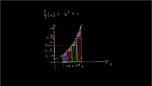 no ponto 1,5. Que é f de 1,5. Essa é a altura. Temos nosso segundo retângulo Então -- e continuamos assim -- tomamos para esse terceiro retângulo, temos a função avaliada no dois. Está bem aqui. É f de dois. E então, temos nosso terceiro retângulo. E, finalmente, temos