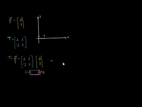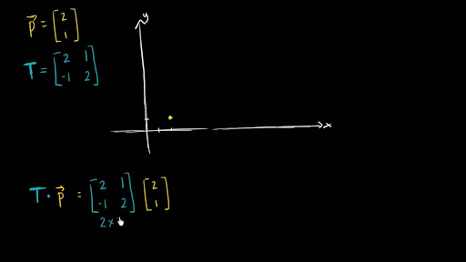 vamos imaginar que eu tenho um vetor peak e que esse meu vetor peixe já sendo representado pelo vetor posição 21 eu vou agora pegar esse vetor de traçar esse vetor vamos ver como é que ficaria se atrasasse esse vetor aqui aqui eu vou ter o meu eixo y esse aqui é o meu eixo y e eu também vou ter o meu eixo x ac esse aqui vai ser o meu eixo x representar esse vetor 21 é porque eu sei que é citada q2 em a coordenadora do eixo x ea coordenadora do eixo y vai ser um então o meu vetor p vai estar representado exatamente aqui nesse ponto se eu quiser eu posso fazer esse símbolo também fazer esse símbolo como se fosse uma causa que começaria na origem o final dele ficaria sobre esse ponto aqui mas vamos deixar apenas a representação com este ponto aqui o que eu quero fazer nesse vídeo é aplicar uma transformação é esse vetor p a maneira que eu vou fazer isso é multiplicar o nosso vetor preposição por uma matriz e o nosso produto resultante vai me dar um outro vetor posição porque eu quero dizer com isso eu poderia dizer que tem uma matriz de transformação ter que dizer que essa matriz pt é igual a nós dizer que é igual a 2 2 - 1 e 2 b e o que acontece eu multiplicaria t por p ou seja vamos fazer isso a multiplicação da transformação ter pelo vetor que vamos primeiro verificar se essa operação é válida nessa operação de matriz há que preservar não vamos lá e pegar rapidamente a minha ferramenta é quente qualquer colar vamos primeiro copiar aqui a matriz t é essa que é uma triste a gente que é multiplicá-la por esse vetor de posição pec a gente quer fazer essa multiplicação animal é triste é uma matriz dos po 2 ea matrí e o vetor de posição p um vetor com dimensões dois por um ea gente consegue ver que pela definição convencional de matrizes essa multiplicação está definida a gente sabe que a definição existe quando na primeira bateria de colunas da primeira bateria foi o gol número de linhas da segunda a gente pode ver que está certo ambos estão com dimensões 2 nessa modificação está definida ea gente pode dizer que a matriz resultante dessa multiplicação vai ser uma matriz dois por um uma matriz com duas linhas e uma coluna que teremos aqui uma matriz dois por um do que interessante a gente perceber é que esse resultado aqui é um novo vetor de posição temos novamente o vetor de posição ou seja nós levamos esse vetor peak né pra uma transformação e aí tivemos um novo vetor também com dimensões dois por um que a gente pode também traz aqui no plano essencialmente esse vetor passou por uma transformação nesse ponto e nos deu um novo ponto vamos pensar sobre isso essa primeira entrada aqui te fazer ela como o porque a gente ainda não trabalhou essa primeira entrada aqui vai ser multiplicação dessa linha aqui por essa coluna que então nós teremos duas vezes 2 nec da 4 mas 11 vezes um que dá um a gente pode dizer então que isso essa primeira entrada vai ter como resultado 5 e na segunda entrada na segunda entrada nós estamos multiplicando essa segunda linha pela coluna então a gente tem menos 1 vezes dores que dá menos dois mais duas vezes um quê de 2 - 2 + 2 nós teremos então na segunda entrada 0 então nosso ver novo vetor de posição é o vetor 50 então temos agora um novo vetor de posição vamos localizá lo aqui no plano o ponto 50 12345 podemos chamar esse novo vetor de posição de vetor pela linha é a transformação do vetor p então vamos representá lo aqui ó esse seria a representação do nosso vetor pela linha nosso vetor pela linha podemos chamar o nosso vetor nosso primeiro vetor podemos colocá lo assim a gente chamou de vetor p&o que nós fizemos nesse vídeo então foi usar essa transformação sobre esse vetor ver aqui e aí a gente tem obter como novo resultado esse vetor telinha que nós utilizamos assim então essa matriz de transformação e obtivemos um novo vetor de posição tá do vetor inicial aqui até mais gente e o próximo vídeo